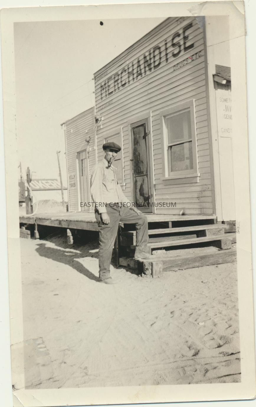 Photo of a man standing in front of the General Merchandise store in Inyokern. He has one foot up on a step and a pipe in his mouth.