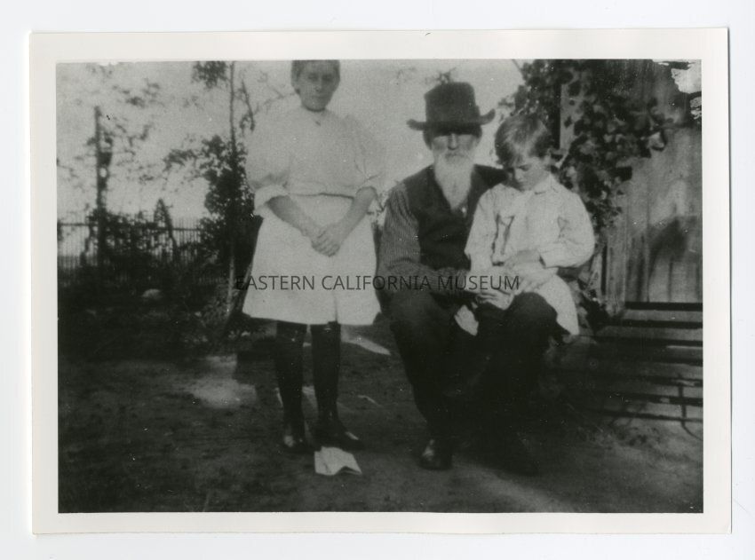Copy of a photograph of James Jones, former member of Inyo County Board of Supervisors, sitting with a young child on his lap and another by his side (grandchildren?). He traveled from Kentucky to Texas to Nevada to Red Mountain Fruit Ranch near Big Pine (Tinnemaha) before the 1872 earthquake. He married Addie Cornell and was the maternal grandfather of the donor.Collection