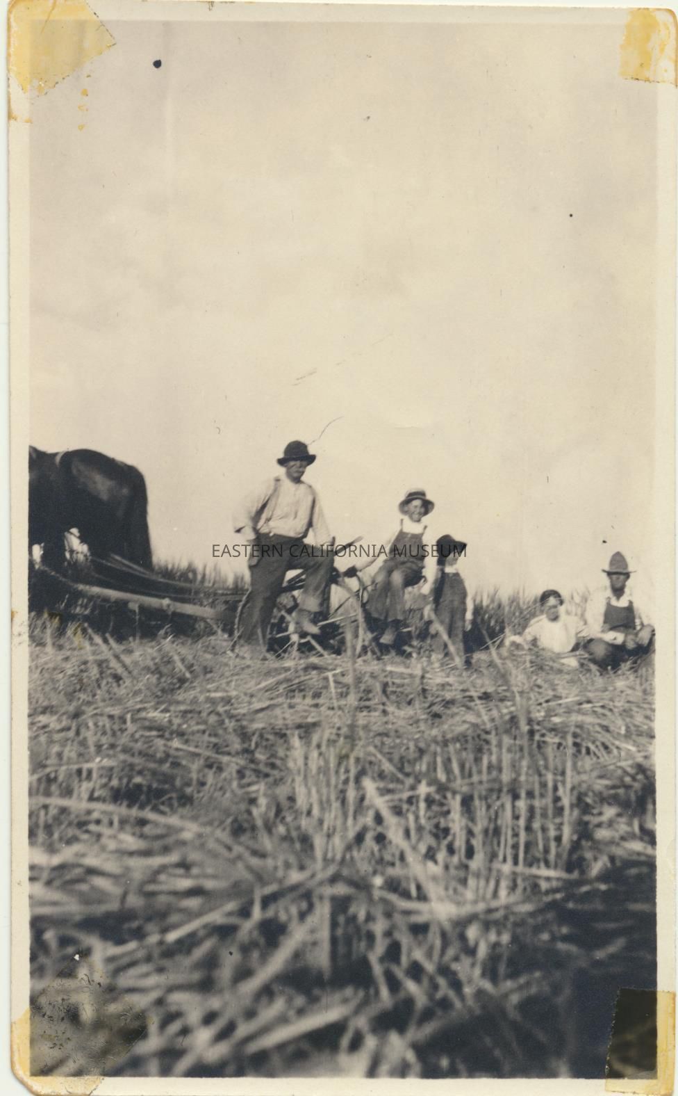 Photo of five people resting in a field of partially cut hay. There is a cutting machine hitched up to two horses on the left side. Location is likely the Callaway Ranch in Inyokern.