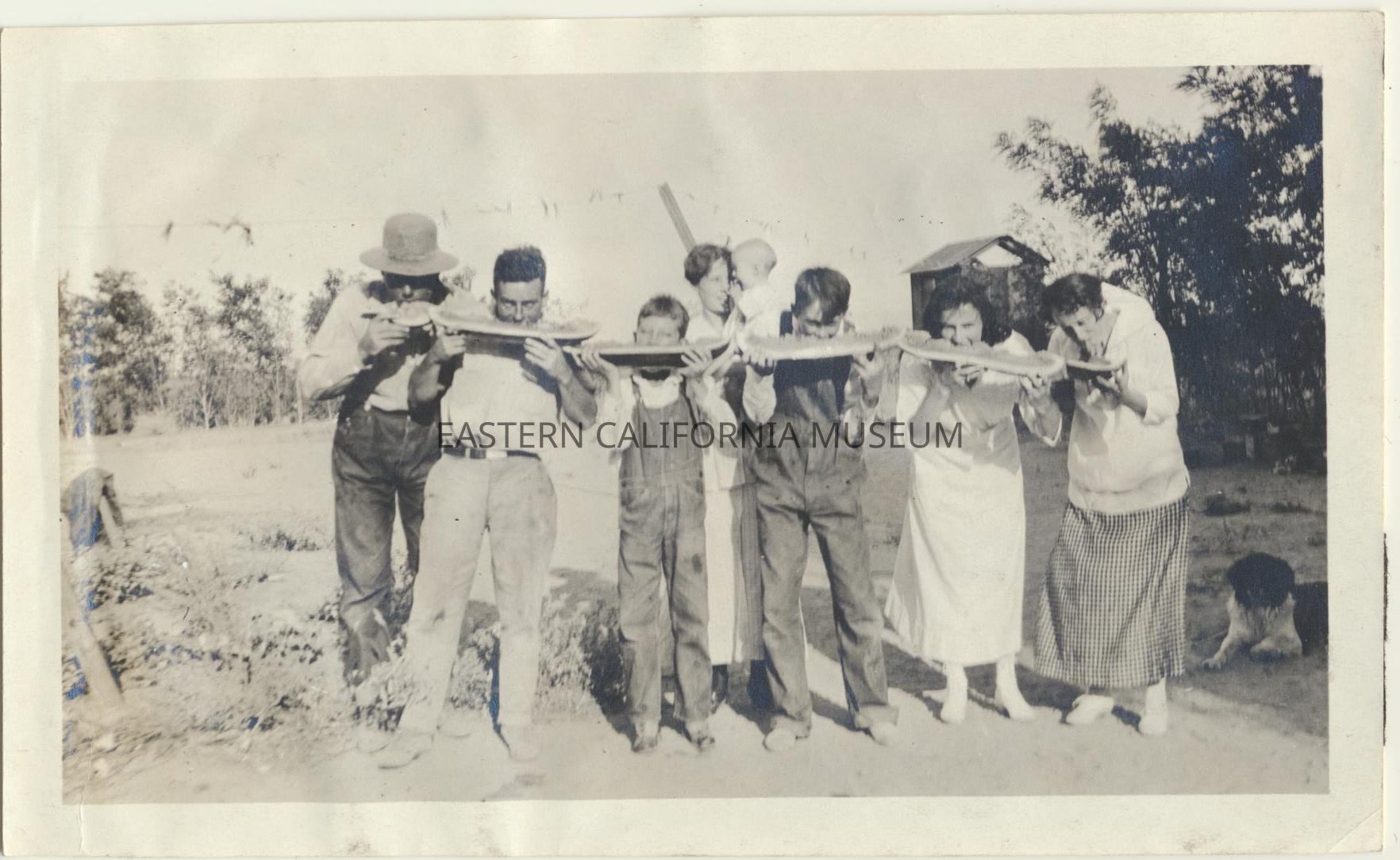 Photo of eight people, six of whom are eating huge slices of watermelon. The woman in the center is holding a baby. There is a dog in the lower right. They are identified on the reverse as: Uncle Will, Harold, Howard, Louella, Art, [illegible], mother.Collection