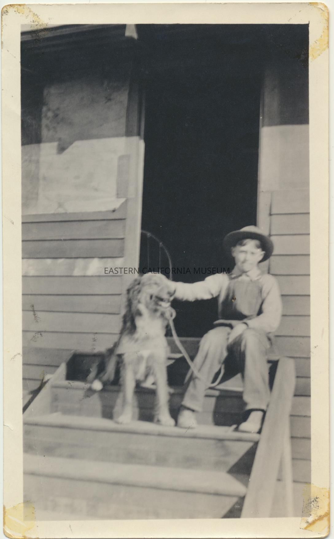 Photo of Arthur "Art" Callaway as a young boy sitting on the steps to a house with a dog.