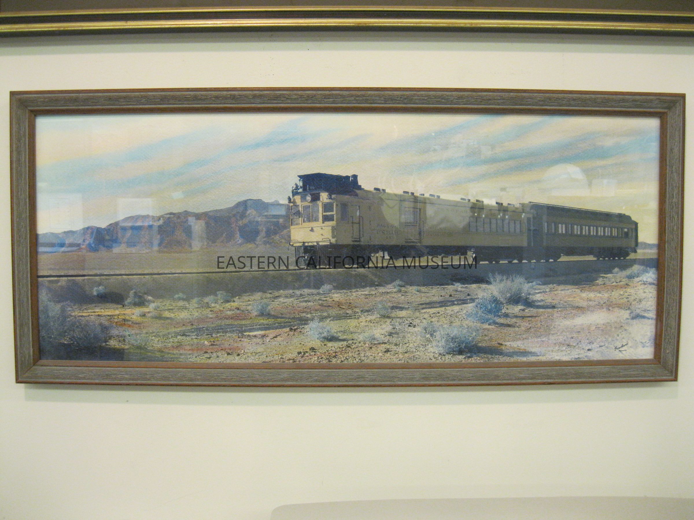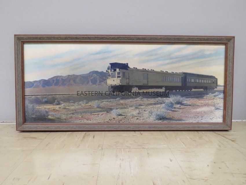 Hand-tinted, framed photograph of the Tonopah & Tidewater Railway, Engine, U.S. Mail car, and passenger car in Death Valley, California.