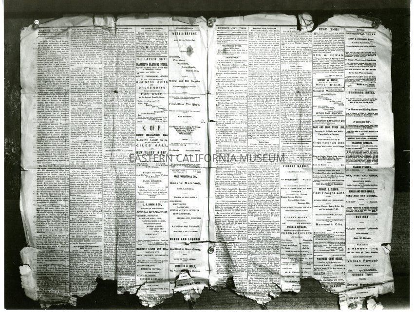 This is a photo print of the newspaper the Mammoth City Times, Vol. 2, No. [illegible], December 31, 1879. This photo is of the newspaper opened up to the inside pages.Made/Created