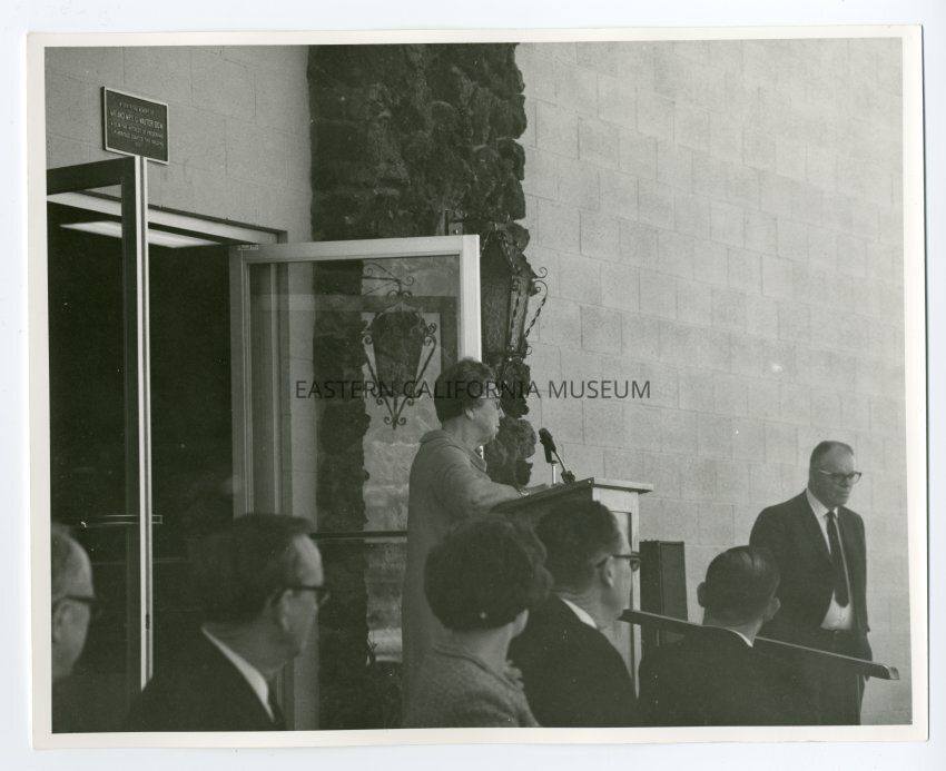 Photo of Dorothy Cragen giving a speech in front of the "new" Eastern California Museum building.