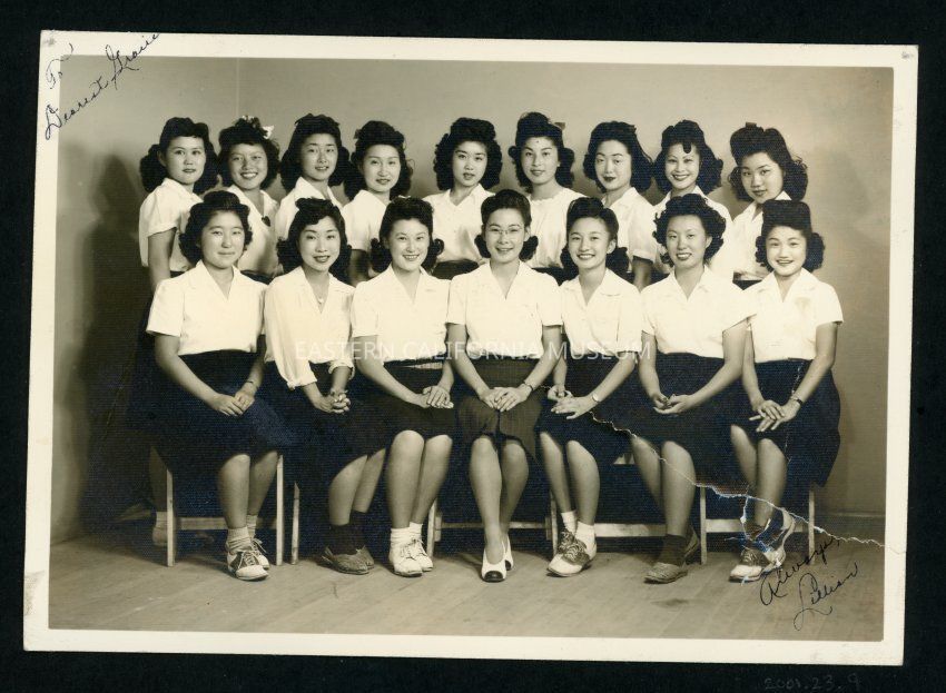 Studio portrait of a group of 16 young women. They are al wearing white shirts with dark colored knee-length skirts. Inscribed in top left corner is "To Dearest Gracie" and in the lower right corner "Always, Lillian."Collection