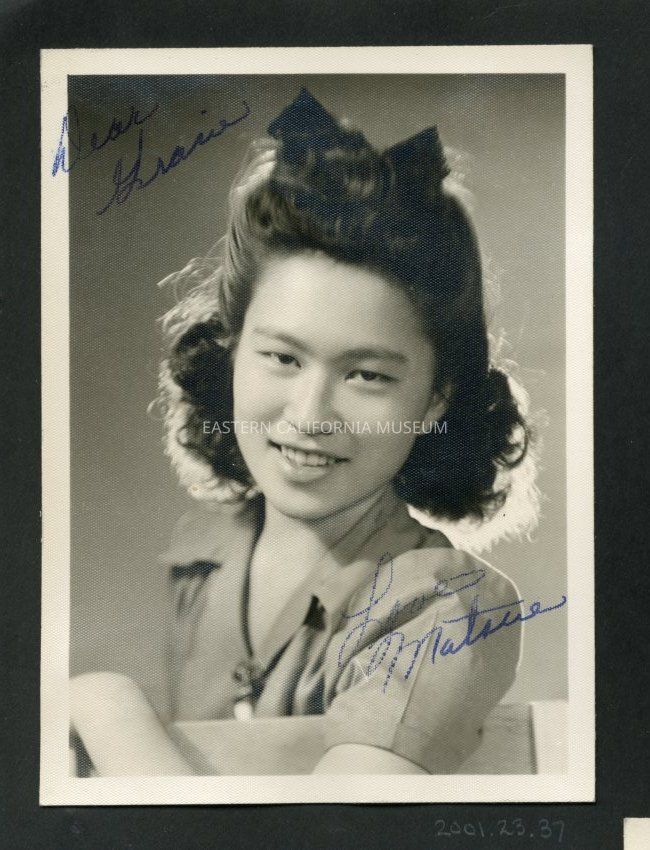 Studio portrait, maybe a school photo, of a young woman. Inscribed in upper left "Dear Gracie" and in lower right "Love, Matsue."Collection