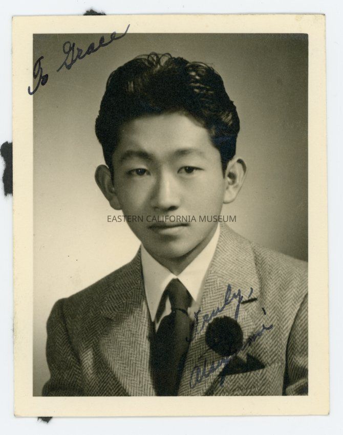 Studio portrait, maybe a school photo, of a young man. He is wearing a tie with a pocket square and may also have a black boutonniere. Inscribed in upper left "To Grace" and in lower right "Truly, Ats-- [illegible name]."