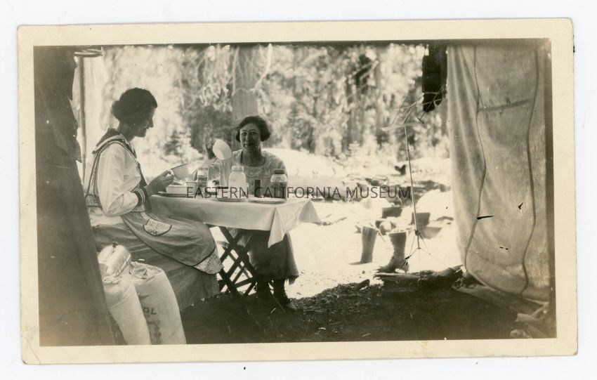 Photo of two women sitting at a folding table that is laid with a white tablecloth and dishes. It appears to be set up in a large tent. They are likely Belle Ragsdale Andrew and Mary Ince.Collection