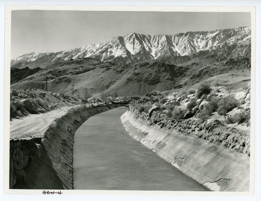 Photo of the open, lined aqueduct south of Lone Pine with the Sierra Nevada in the background.