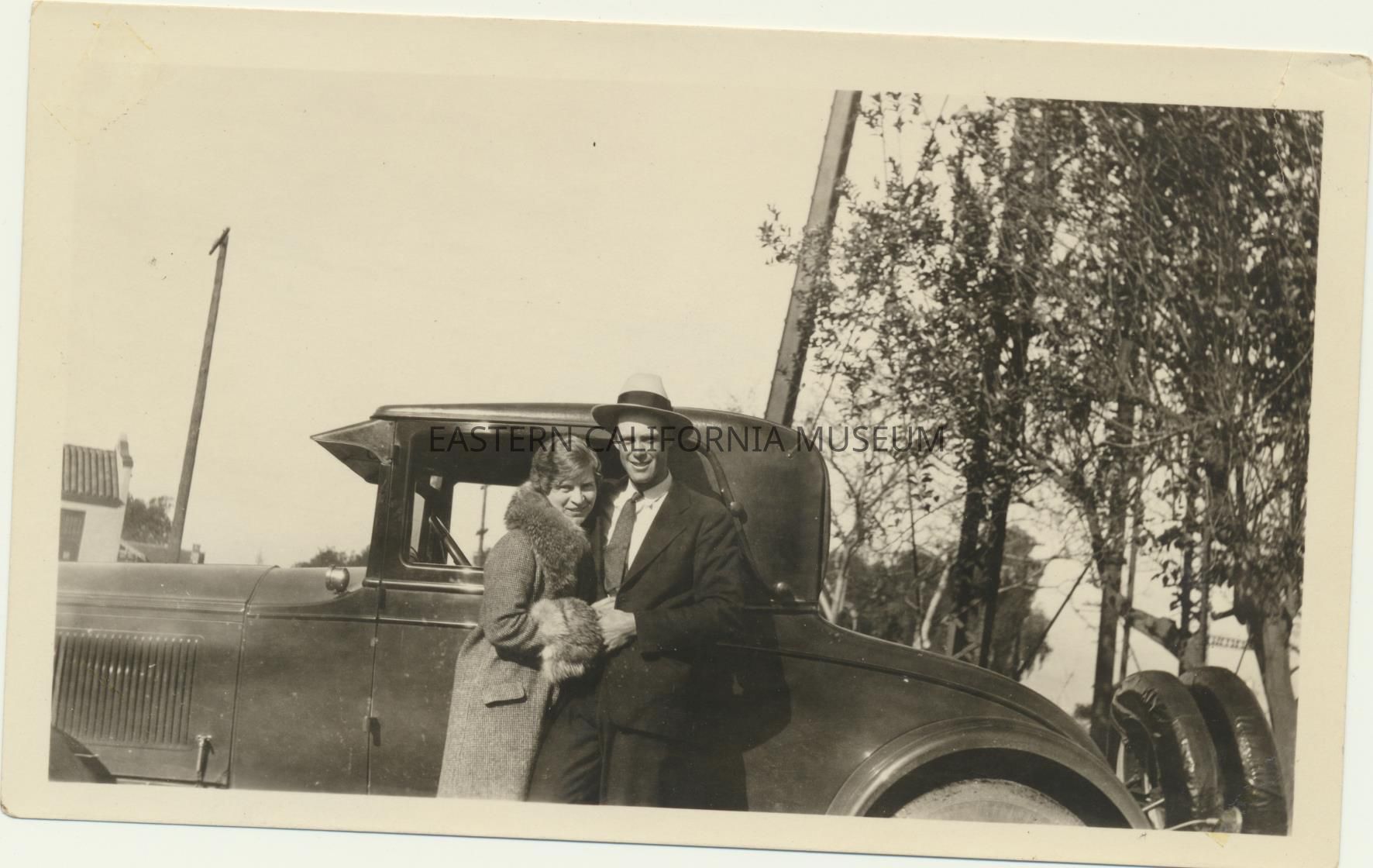 1995.12.34.67b--Standing together in front of a vehicle. Lucille is wearing a coat with fur trim.