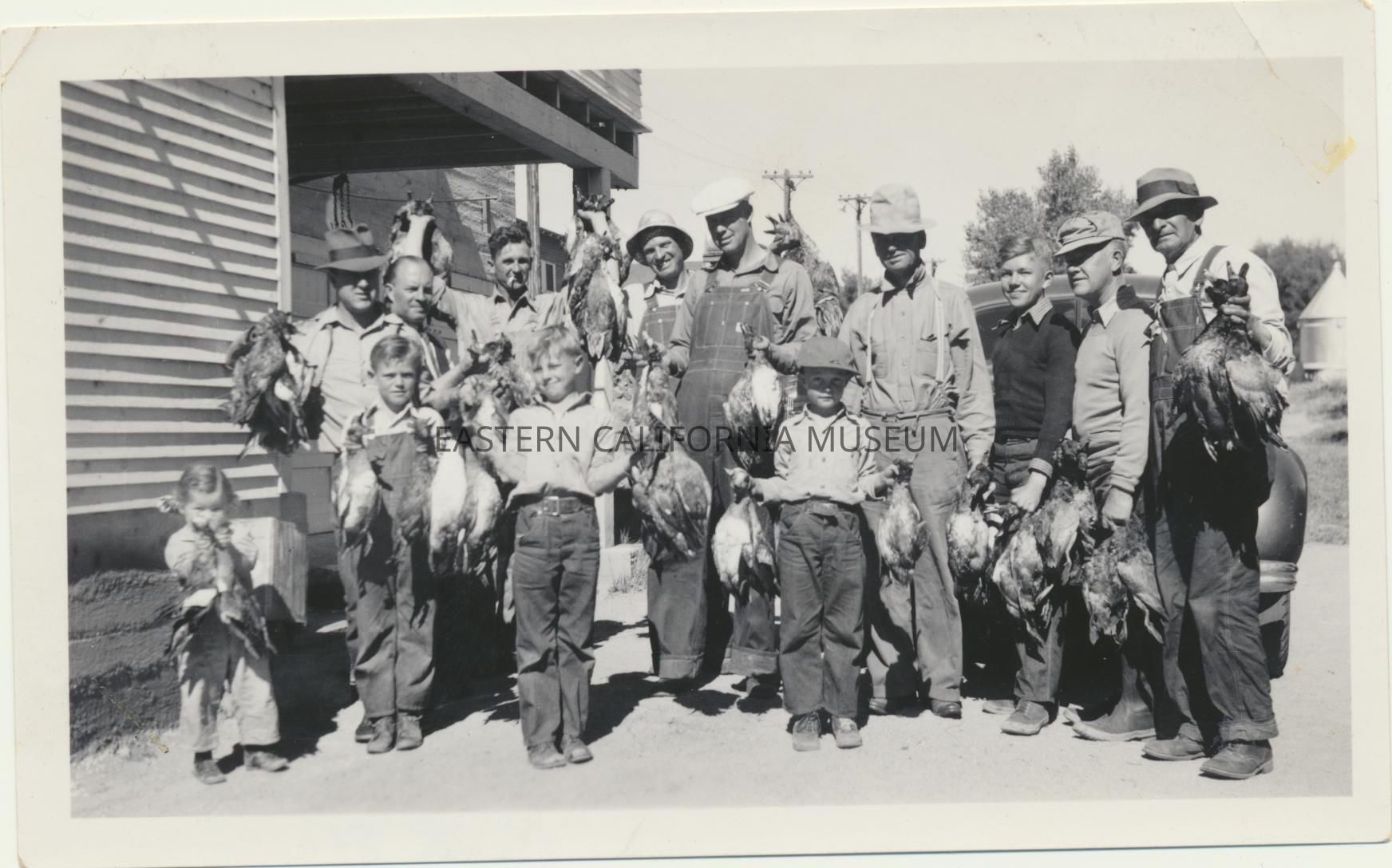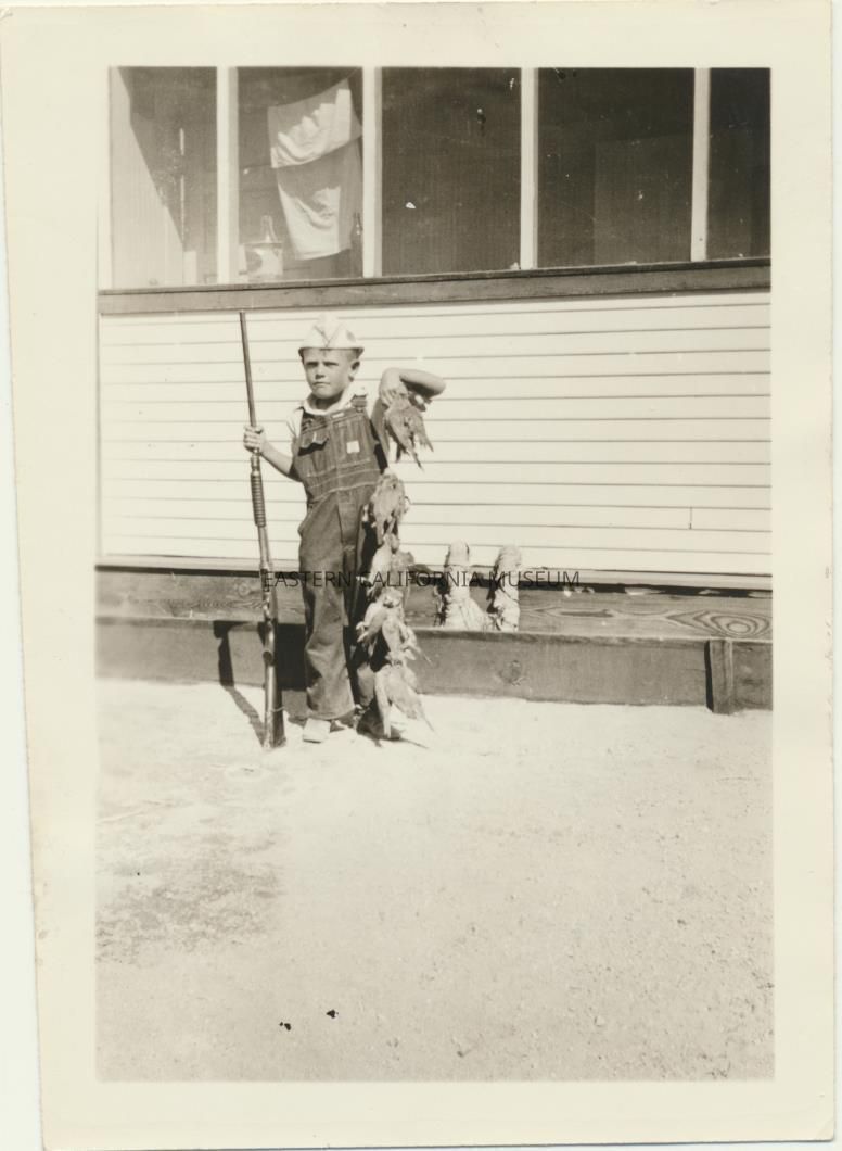 1995.12.37.70b--Little boy holding up a stringer of ducks and holding a gun that is taller than he is. Written in pencil on reverse is "Wayne Callaway, c. 1937."