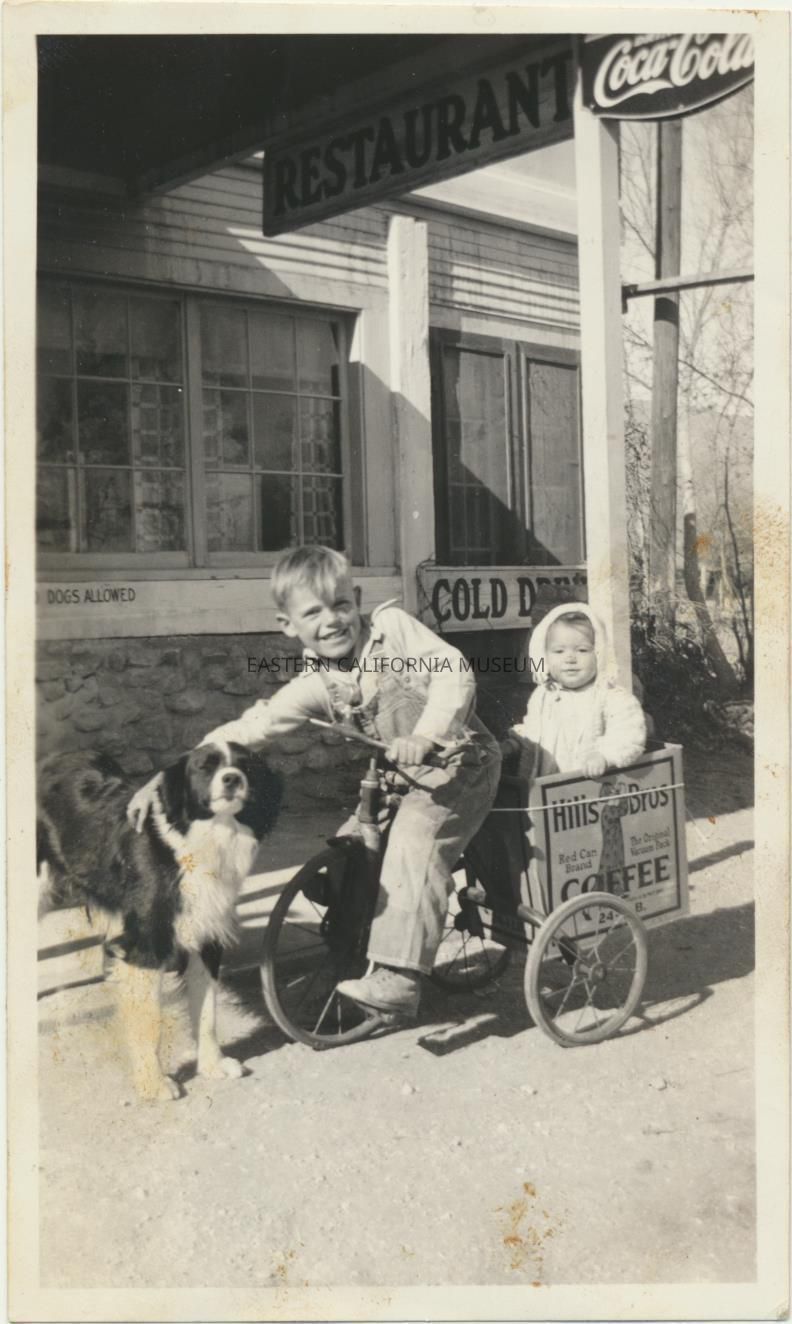 Photo of Wayne and Gwen Callaway on a modified tricycle with a dog ("Tippy") in front of a restaurant. A Hills Bros Coffee box has been tied to the back of the tricycle so the little sister can ride as a passenger. There is a sign advertising Coca-Cola in the upper right corner.