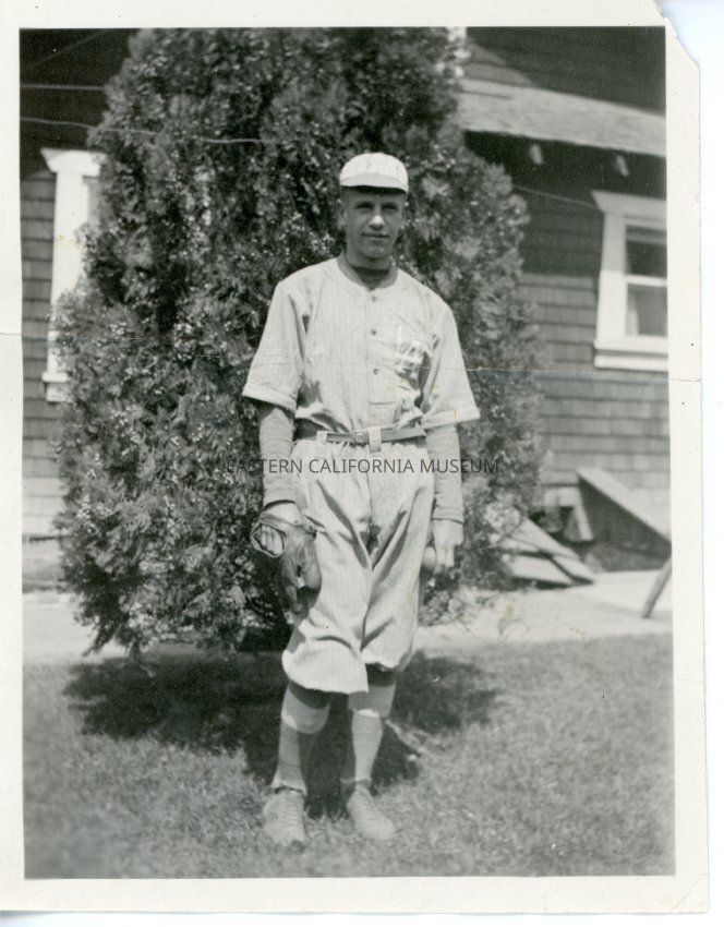 Photograph of a man standing in front of a house and juniper bush in a baseball uniform. "L.A." is embroidered on the shirt. Writing in pencil on reverse: Ray Mairs.