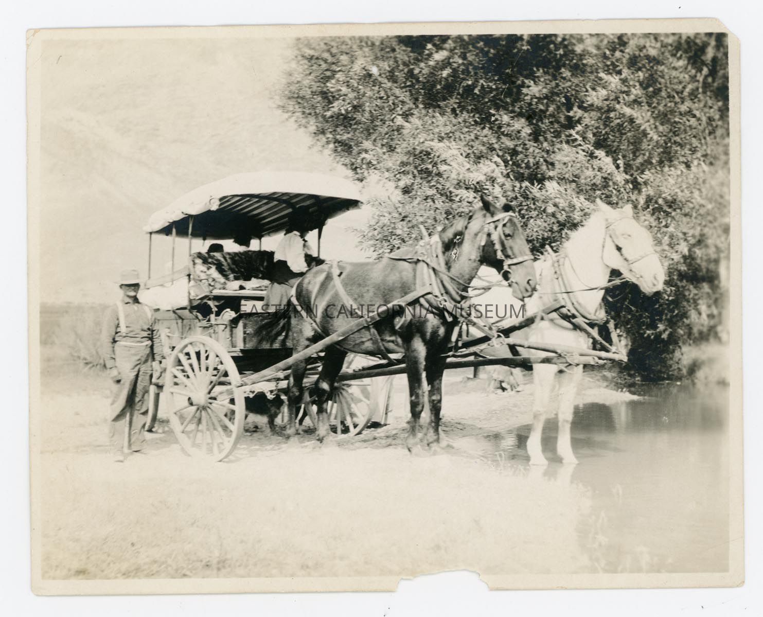 Photo of man standing next to a wagon (a surrey?) with a flat covered roof. It is pulled by two horses and has fabric or canvas panels that can be let down to enclose the riders (they are currently rolled up and fastened). They are stopped in front of a puddle of water with a big tree in the background. There is a small area of missing material along the bottom edge of the photo.