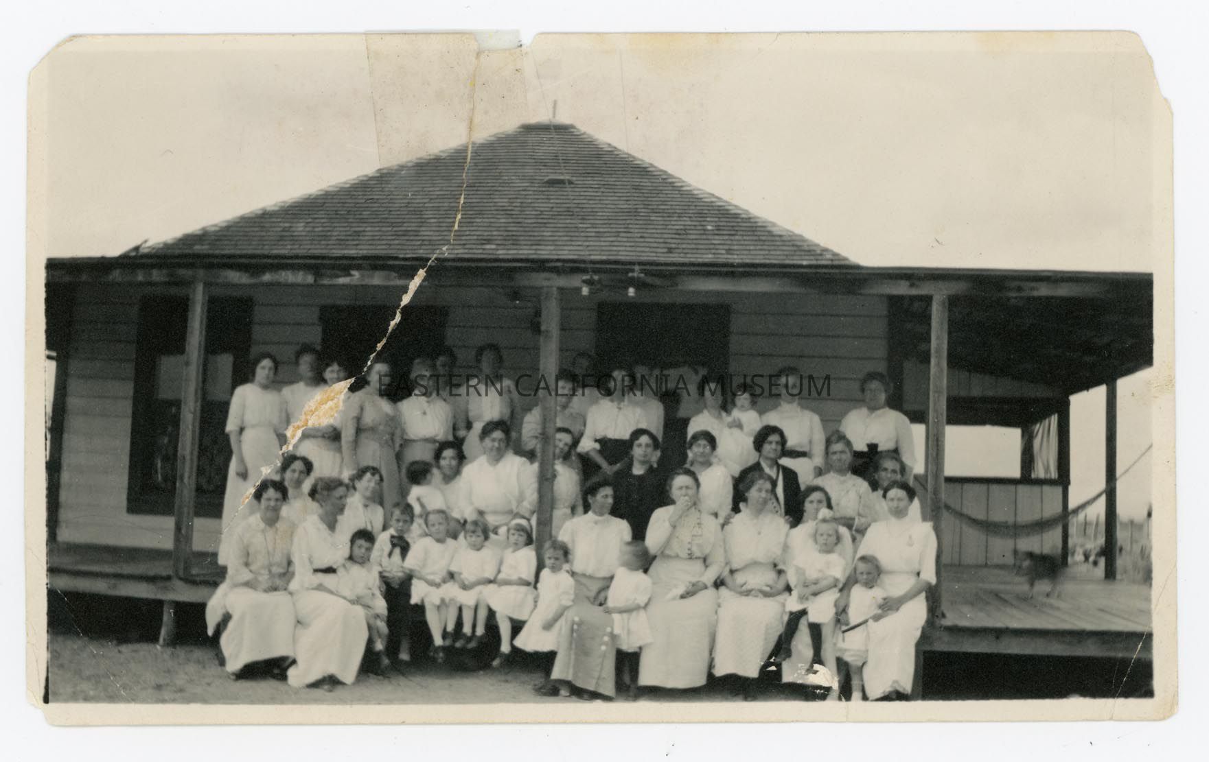 Photo of a large group of women and children standing on the covered porch of a house. Most are dressed in white. Location may possibly be a ranch house at Manzanar circa 1906.