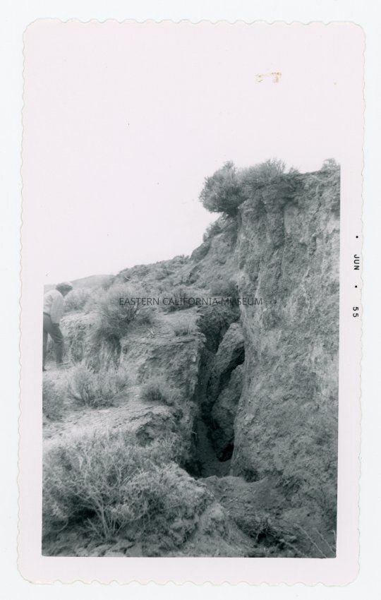Photo identified on reverse as being an earthquake crack near Gabbs, Nevada in 1954. Photo was printed in June of 1955.