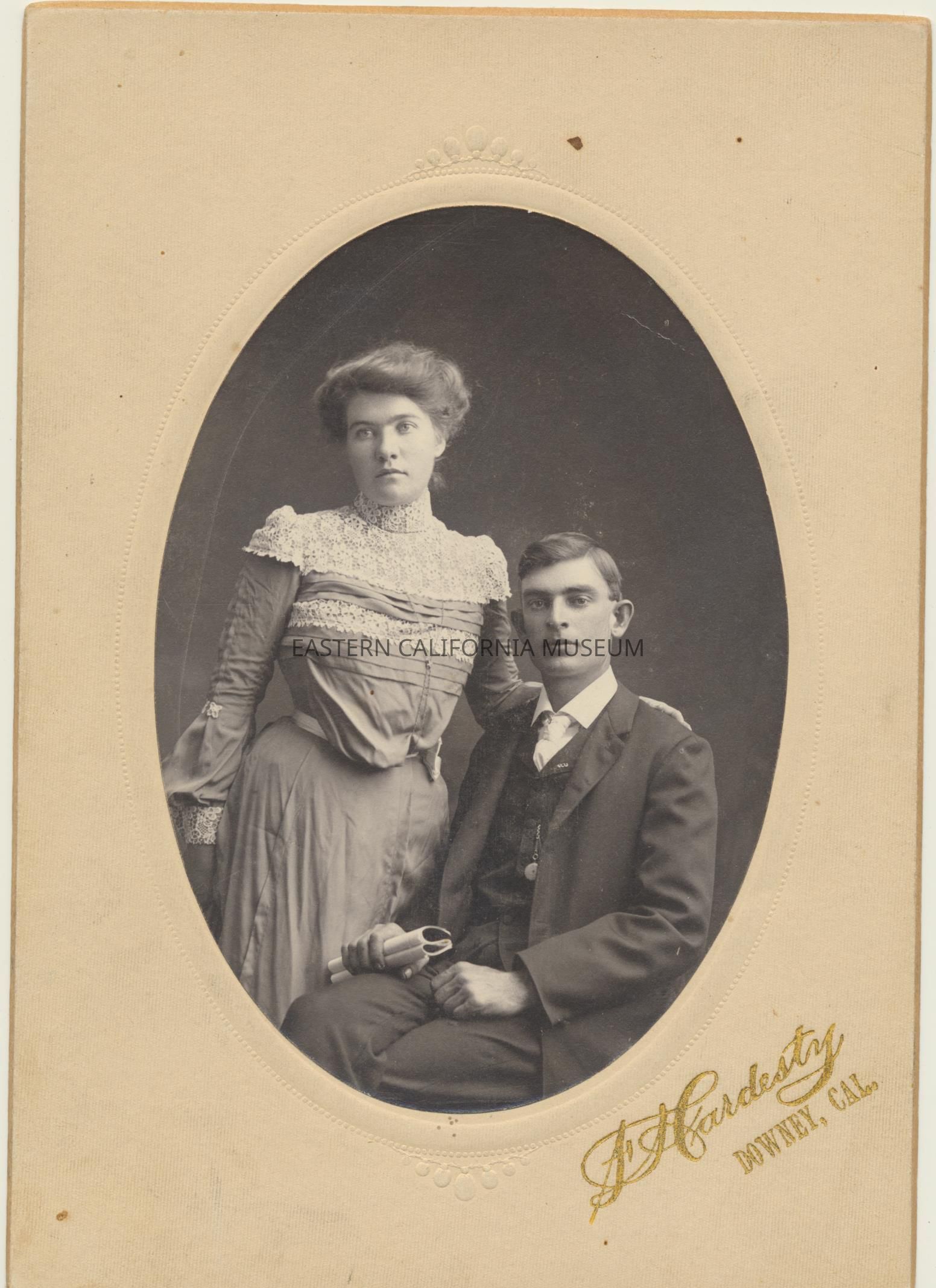 Mounted studio portrait of a man and woman identified as Elvira and William Bramlette. The photographer was Hardesty of Downey, CA.