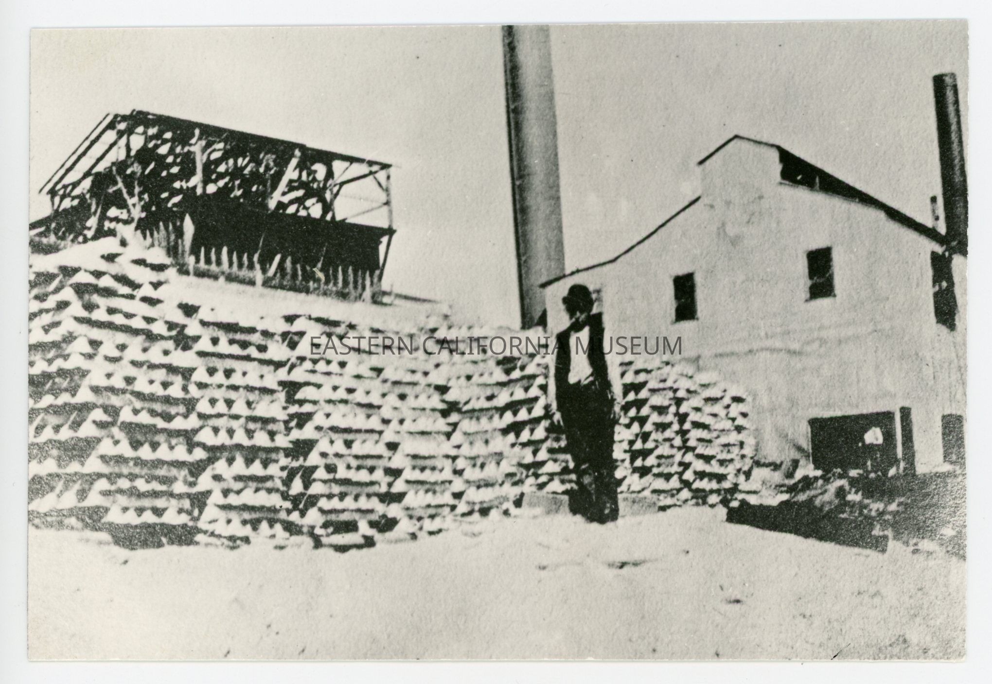 Photo of an unidentified man standing in front of tall stacked piles of silver-lead bullion bars. The building in the background is likely the Four Metals Smelter, which was located east of Keeler in the late 1890s.