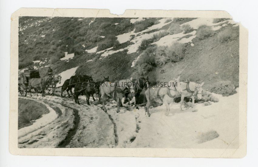 Information from a possible duplicate accession number (1978.689): Photograph of Owen L. Dearborn taken in 1910 driving a team of eight mules up Cerro Gordo Grade. He was 17 years old. Owen and his father, Oscar P. Dearborn, also hauled freight from Lone Pine to Mojave, and it would take three weeks one way sometimes.Collection