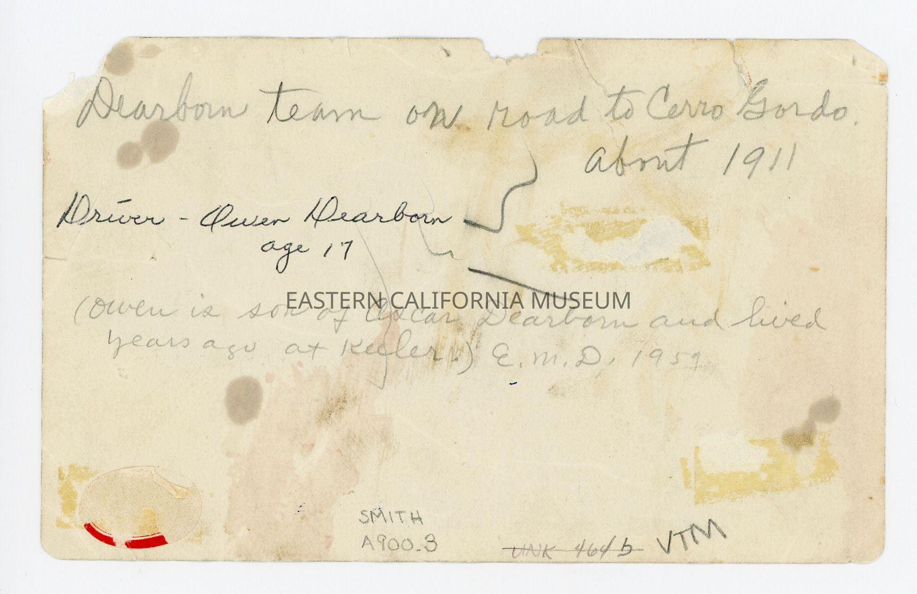 Handwritten in pencil on reverse: Owen is son of Oscar Dearborn and lived years ago at Keeler. E.M.D. 1959.