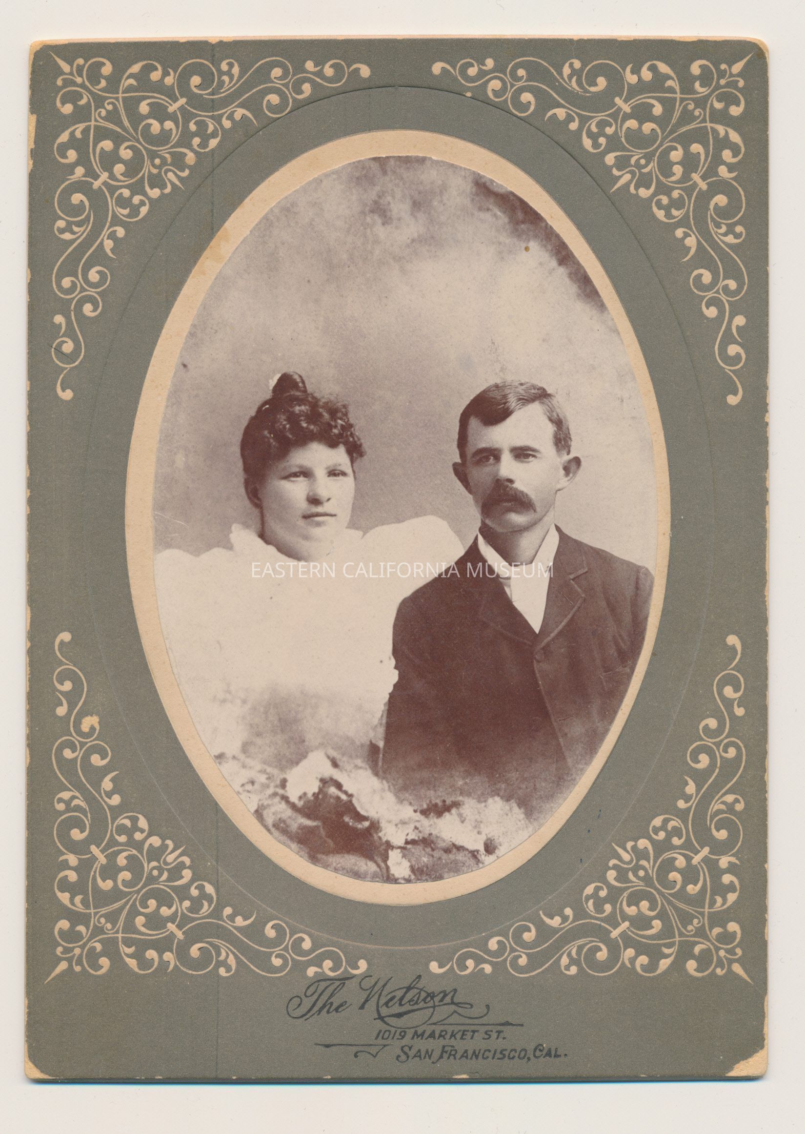 Mounted studio portrait of a man and woman who have been identified on the reverse as Mr. and Mrs. David Stuart Drew. She is Ora Virginia Roberts, and this is their wedding portrait. The photo is mounted on a backing from "The Nelson" in San Francisco, CA.