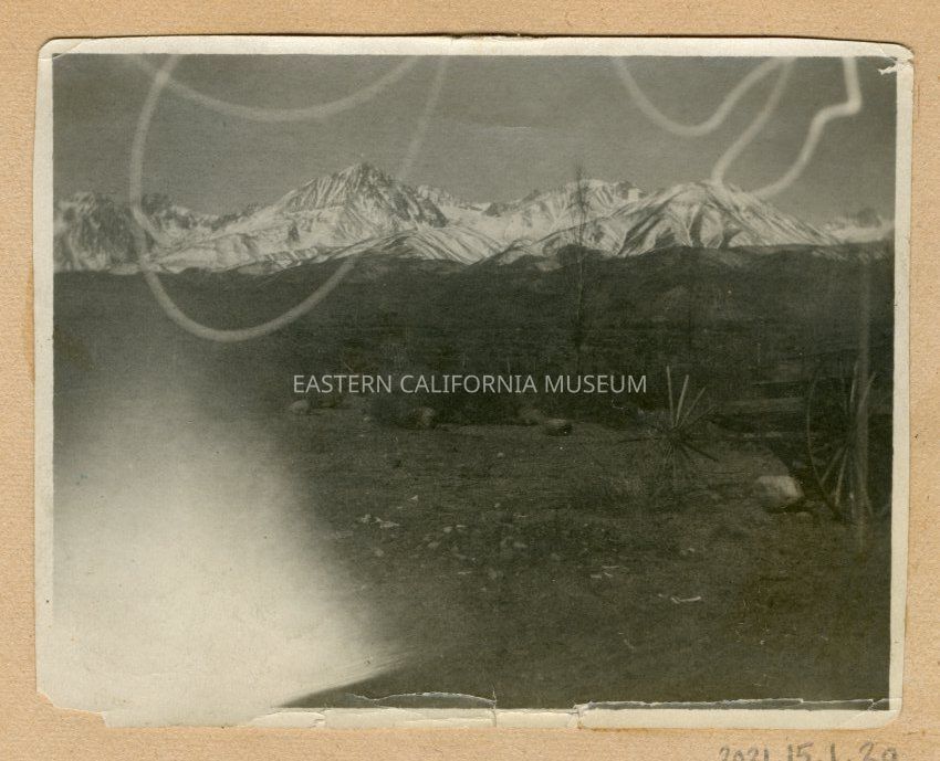 Photo of the Sierra Nevada mountain range covered in snow. Wagon in the foregound, white overexposure in lower left corner, squiqqly white line (a bug?) near top.