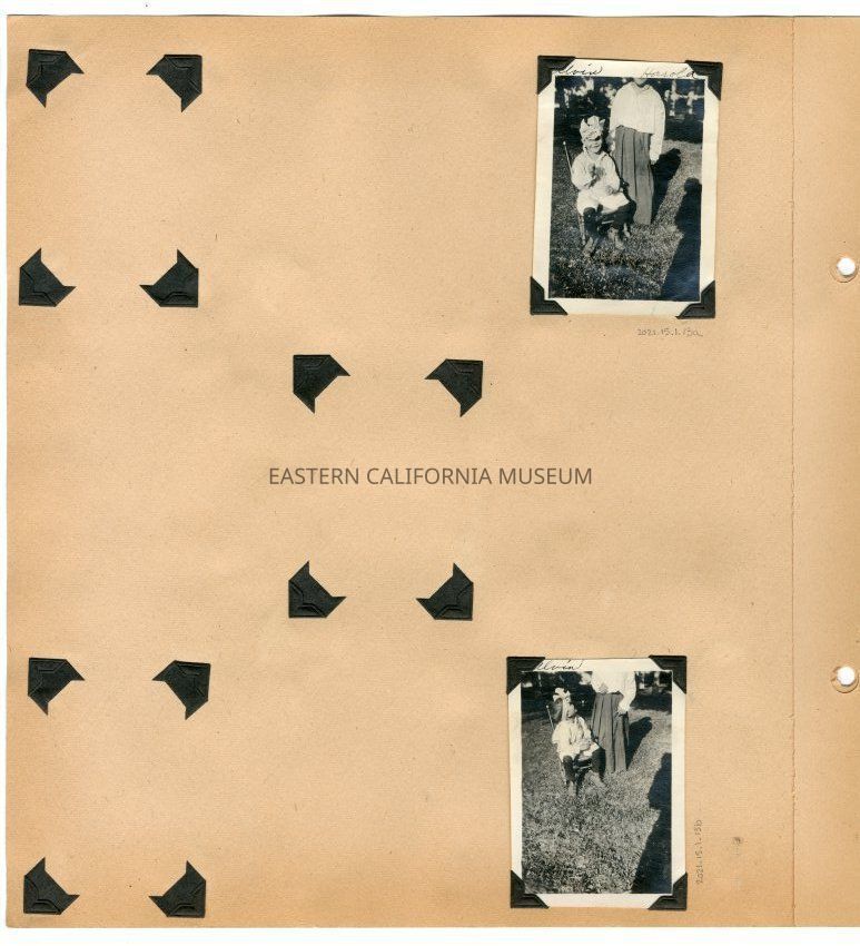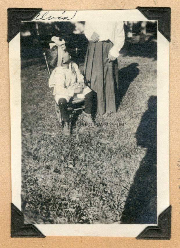Photo of a little boy sitting on a char twisting around to look at someone standing beside him whose head is not in the frame. The little boy is identified as Alvin and the other person is likely Harold (as identified in 2021.15.1.13a).Collection