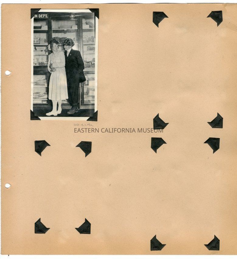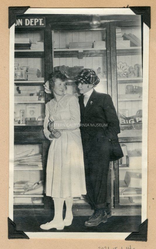 Photo of a young couple posing in front of a wall of a wall of shelves. There appear to be games, dolls, books, and a Big Pine pennant. A sign in the upper left says, "--on Dept."Collection