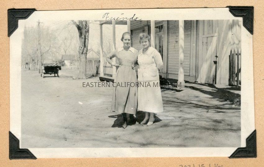 Photo of two young women standing in a dirt street in front of a building with a covered front porch. It is labeled, "Friends" and has "3-18" written in the lower right corner.Collection