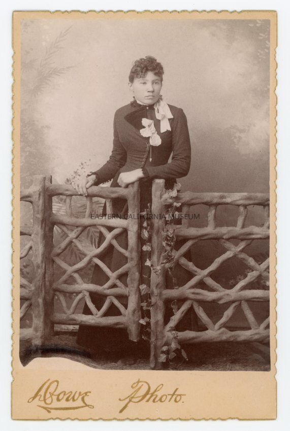 Mounted full-length studio portrait of an unidentified woman leaning against a rustic branch fence. The photographer was Dowe. The mount has scalloped edges.Collection