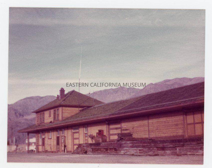 Color photo of the Lone Pine railroad station. Written on reverse: Lone Pine railroad station, Feb. '84. Cat on roof to left.