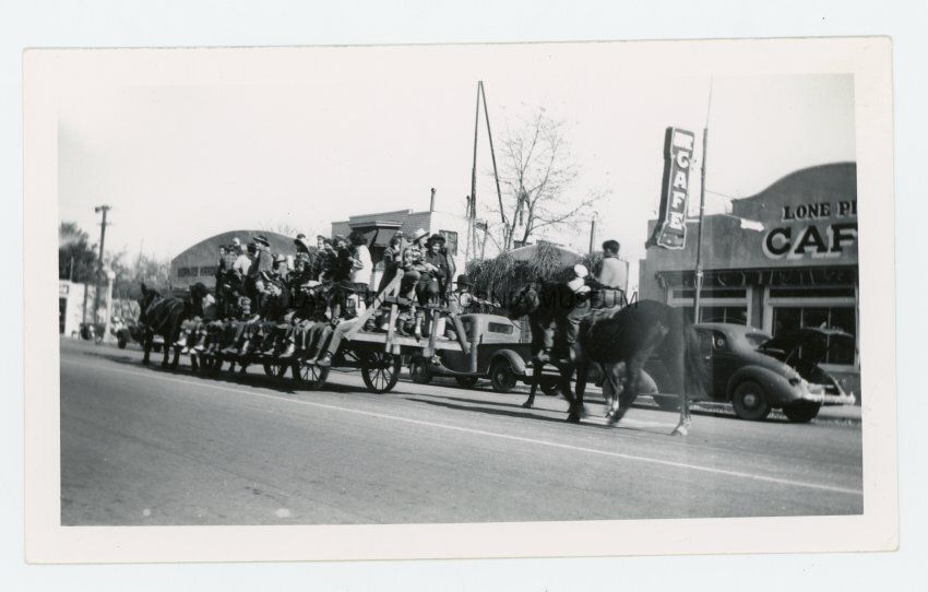 Photo of a horse-drawn parade float. On the other side of the street is the Lone Pine Cafe.