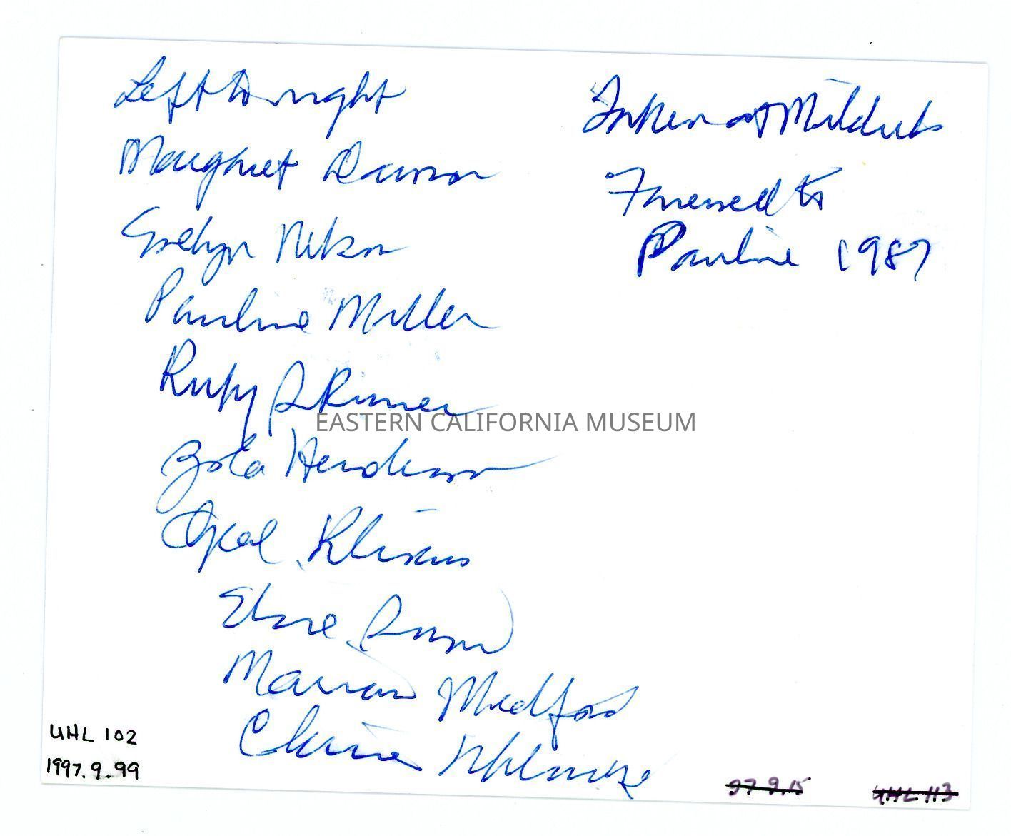 Handwritten in blue ink on reverse: Taken at Mildred's, farewell to Pauline, 1987. Left to right: Margaret [illegible], Evelyn Nelson, Pauline Miller, Ruby Skinner, Zola Henderson, Opal [illegible], Elsie [illegible], Marian Medford, and Clarice Uhlmeyer.