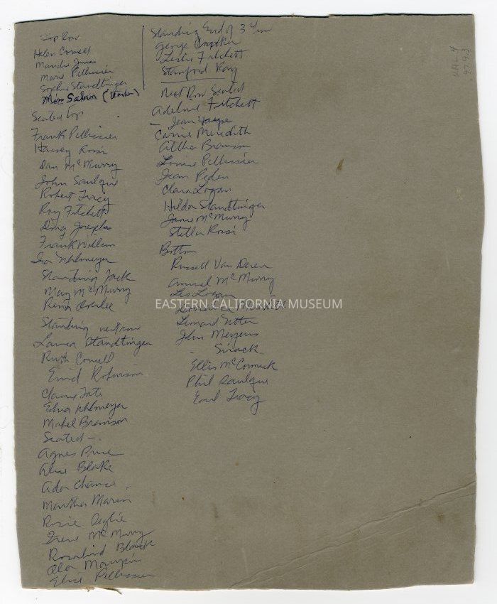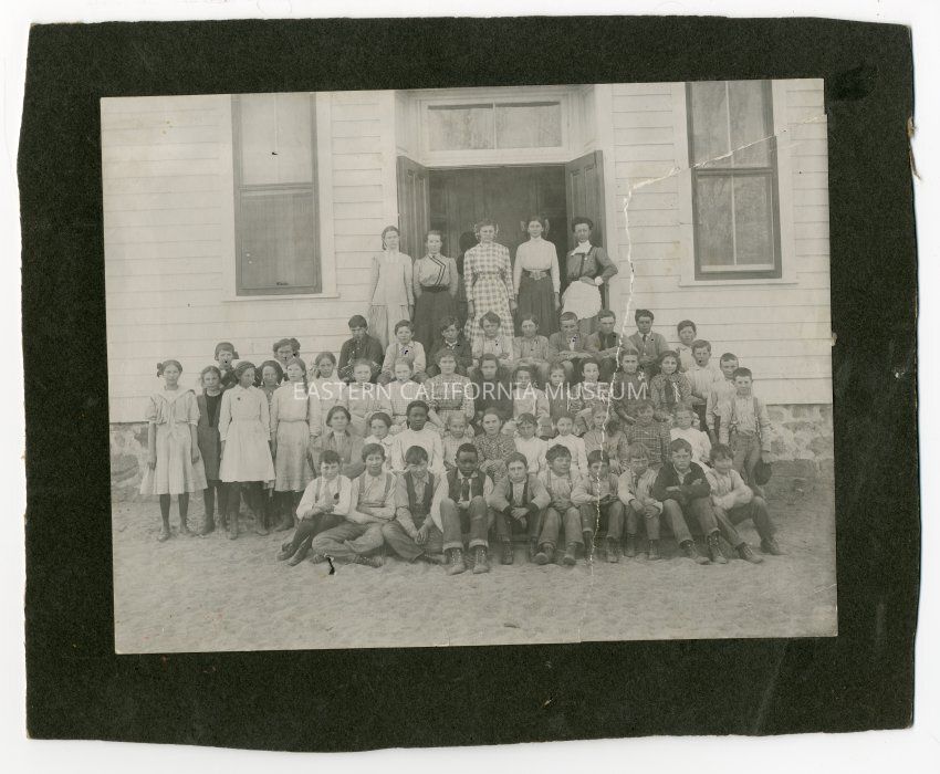 Large mounted class or school photo of Big Pine students, date unknown (pre-1916 when Clarice Uhlmeyer graduated). They are identified on the reverse.