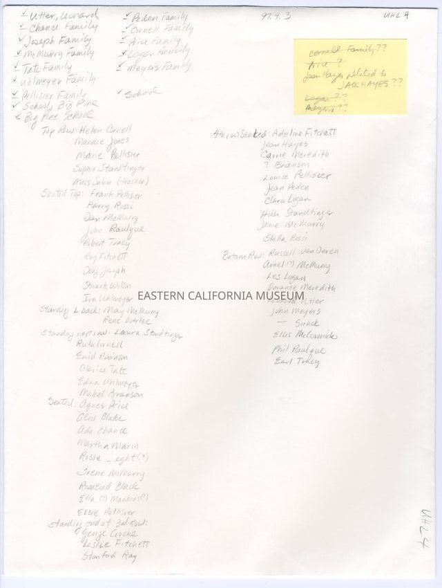 Spellings may be incorrect due to difficulties in reading the handwriting. Top row: Helen Cornell, Mandie Jones, Marie Pellisier, Sophie Standtinger, Miss Sabin (teacher). Seated top: Frank Pellisier, Harry Rossi, Dan McMurry, John Saulque, Robert Tracy, Roy Fitchett, Doug Joseph, Frank Wilson, Ira Uhlmeyer. Standing left back: May McMurry, Rene Overlee. Standing next row: Laura Standtinger, Ruth Cornell, Enid Robinson, Clarice Tate, Edna Uhlmeyer, Mabel Branson. Seated: Agnes Price, Alice Blacke, Ada Chance, Martha Marin, Rosie [illegible], Irene McMurry, Rosalind Black, Ella Maupin, Elsie Pellisier. Standing end of third row: George Crocker, Leslie Fitchett, Stanford Ray. Fourth row seated: Adeline Fitchett, Jean Hayes, Carrie Meredith, Althea Branson, Louise Pellisier, Jean Peden, Clara Logan, Hilda Standtinger, Janie McMurry, Stella Rossi. Bottom: Russell Van Deren, Arnel McMurry, Les Logan, Dorance Meredith, Leonard Utter, John Meyers, [unknown] Sirack, Ellis McCormick, Phil Saulque, Earl Tracy.Collection