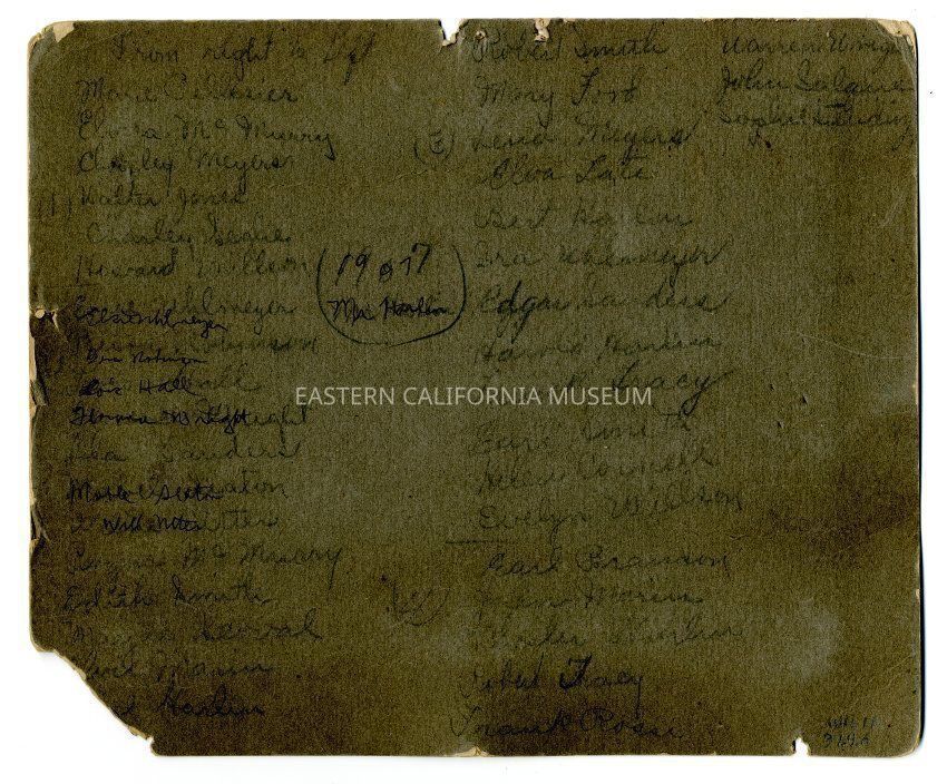 Spellings may be incorrect due to difficulties in reading the handwriting. 1907 Mr. Harlin in center of group. From right to left: Marie Pellisier, Elvira McMurry, Charley Meyers, Walter Jones, Charley Seglie, Howard Willson. Second row: Elsie Uhlmeyer, Bessa Robinson, Lois Hall, Florence Wright, Lila Sanders, Mable Seaton, Will Utter, Regina McMurry, Edith Smith, May Scoval, [illegible] Marlin, [missing] Harlin. Third row: Robert Smith, Mary Ford, Lena Meyers, Elva Late, Bert Harlin, Ira Uhlmeyer, Edgar Sanders, Harold Harlin, Frank Lacey, Earl Smith, Helen Cornell, Evelyn Wilson. Fourth row: Earl Branson, John Marlin, [illegible] Harlin, Robert Tracy, Frank Rossi, Warren [illegible], John Salque, Sophie [illegible].Collection