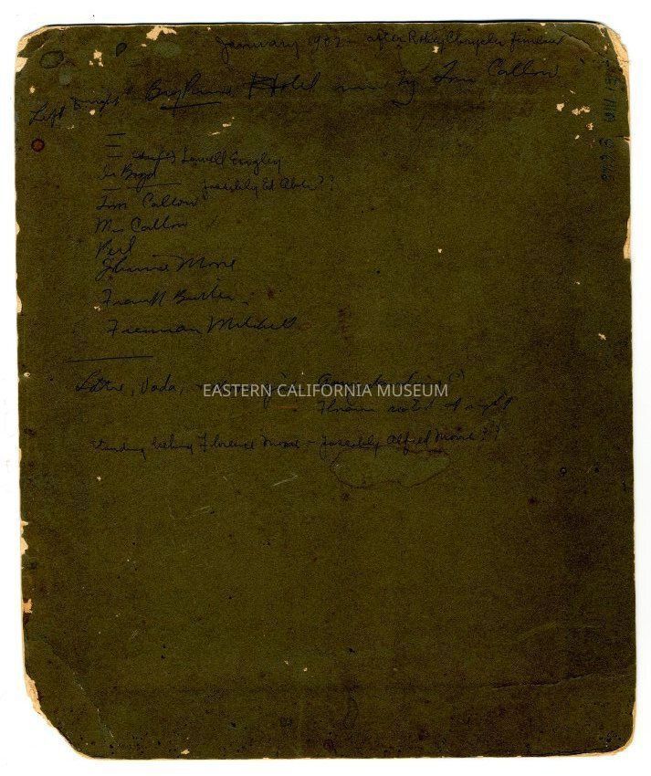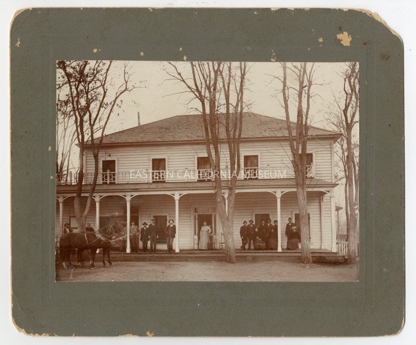 Large mounted photo of people standing in front of a two story building that is identified as the Big Pine Hotel run by Tom Callow. Dated January 1902 after the funeral of Robey Chrysler funeral.