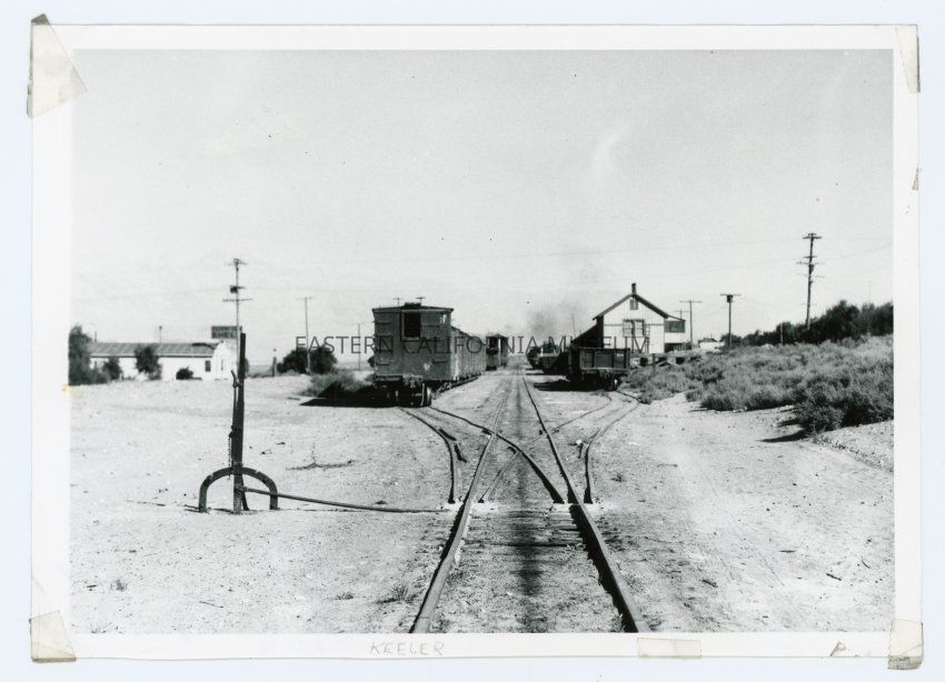 Photo of the railroad tracks at Keeler in 1935. Written in pencil below the photo: Keeler.