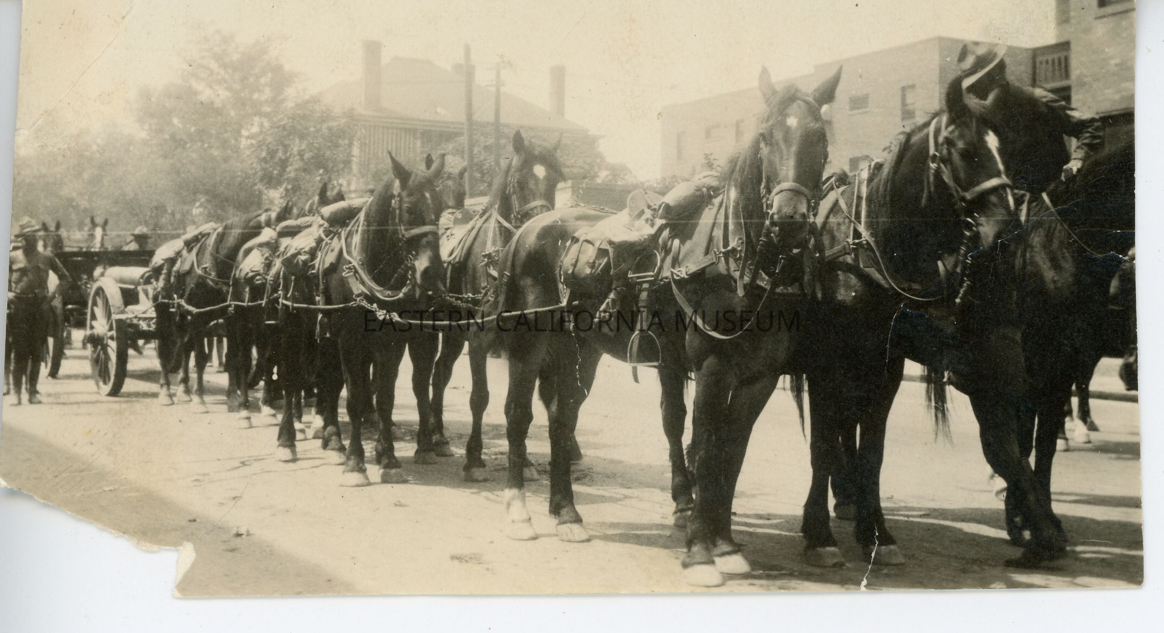 Photo that appears to have been cut down and affixed to a scrap album at some point. Photo is of a row of horses harnessed to a wagon. Buildings visible in background.