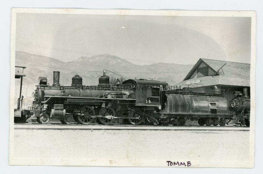 Photo postcard of Southern Pacific engines #14 and #17 (and a tender car?) in front of the Keeler railroad station. It looks like they might be hooked up to a diesel engine.