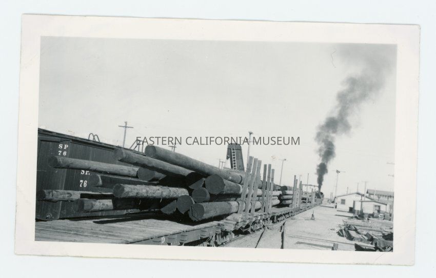 Photo of Southern Pacific flatbed cars hauling poles. Station and depot visible to right, Southern Pacific boxcar #76 on left.