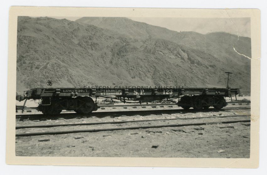 Photo of Southern Pacific flatbed car #123. The top right corner has been torn off and reattached.