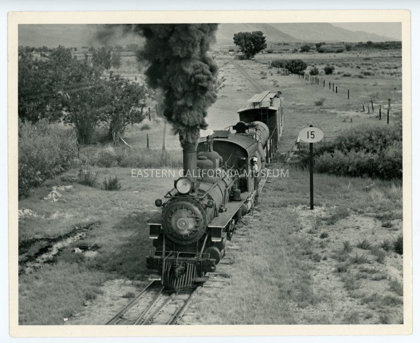 Photo of Southern Pacific engine #18 by a sign/marker that says "15." A man (engineer?) is leaning out the cab. The engine is only hauling the tender, a tank car, and a caboose. There is a plume of black smoke coming out of the smokestack.