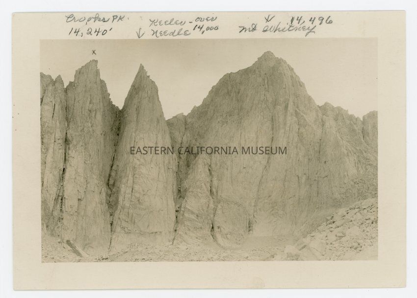 Photo of Crooks Peak (14,240 ft.), Keeler Needle (over 14,000 ft.), and Mt. Whitney (14,496 ft.). Someone has writen the name of each peak and its elevation above the photo.Collection