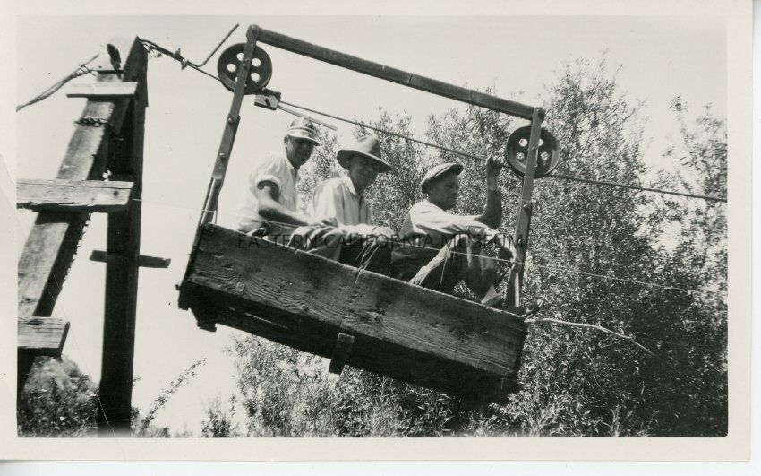 Photo of three unidentified men sitting in a wooden pulley or cable car, likely used to cross the Owens River.