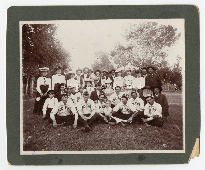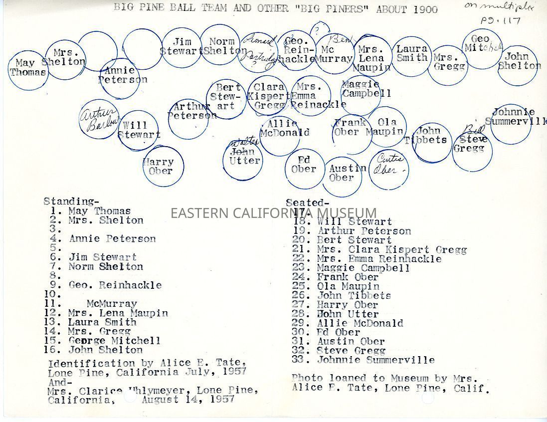 A typewritten paper gives the following information from Alice Tate and Clarice Uhlmeyer in 1957: Big Pine ball team and other "Big Piners" about 1900. May Thomas, Mrs. Shelton, Annie Peterson, Jim Stewart, Norm Shelton, Geo. Reinhackle [Reinhakel], McMurray, Mrs. Lena Maupin, Laura Smith, Mrs. Gregg, George Mitchell, John Shelton, Will Stewart, Arthur Peterson, Bert Stewart, Mrs. Clara Kispert Gregg, Mrs. Emma Reinhackle, Maggie Campbell, Frank Ober, Ola Maupin, John Tibbets, Harry Ober, John Utter, Allie McDonald, Ed Ober, Austin Ober, Steve Gregg, Johnnie Summerville.Collection