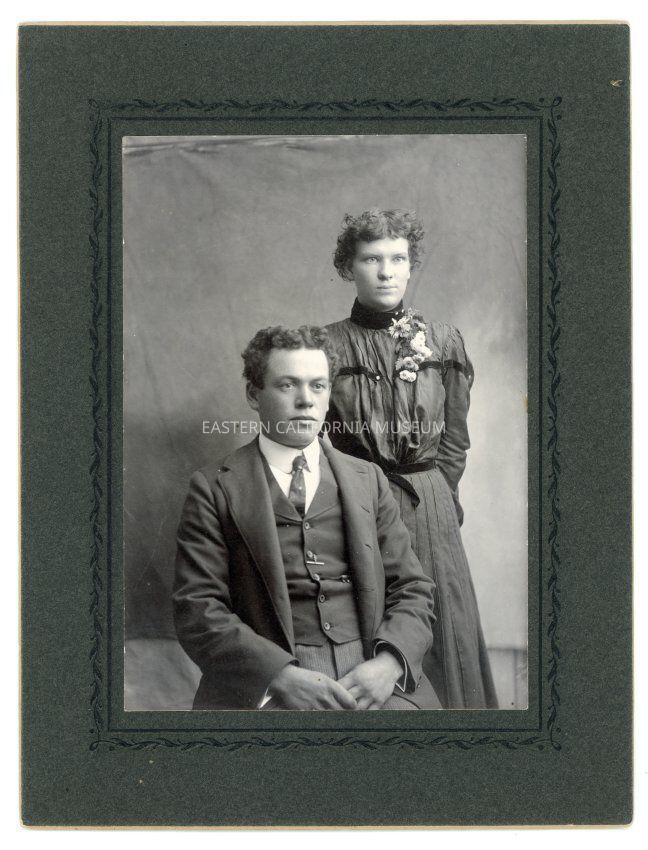 Mounted studio portrait of Mr. and Mrs. Ed Stout who ran a livery stable with the Tate family in Big Pine. Mrs. Stout's maiden name was Blanche May.