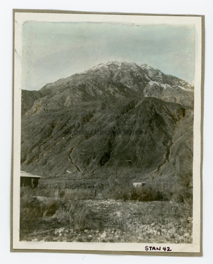 Tinted photo of the west side of the salt lake in Saline Valley, looking west at the ridge dividing Hunter Canyon the right and Craig Canyon on the left.Collection