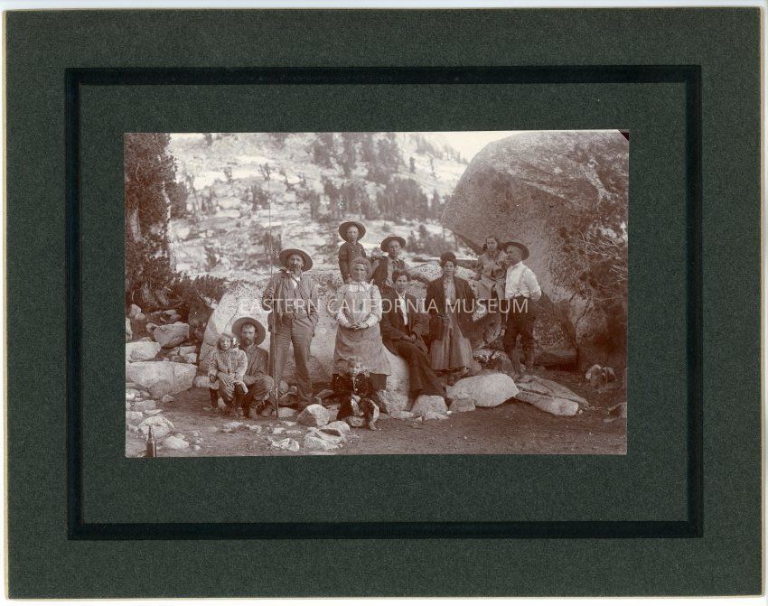 Mounted photo of a large group of people (eleven total) in the wilderness, possibly Yosemite. One man holds a fishing pole as they pose around large boulders.