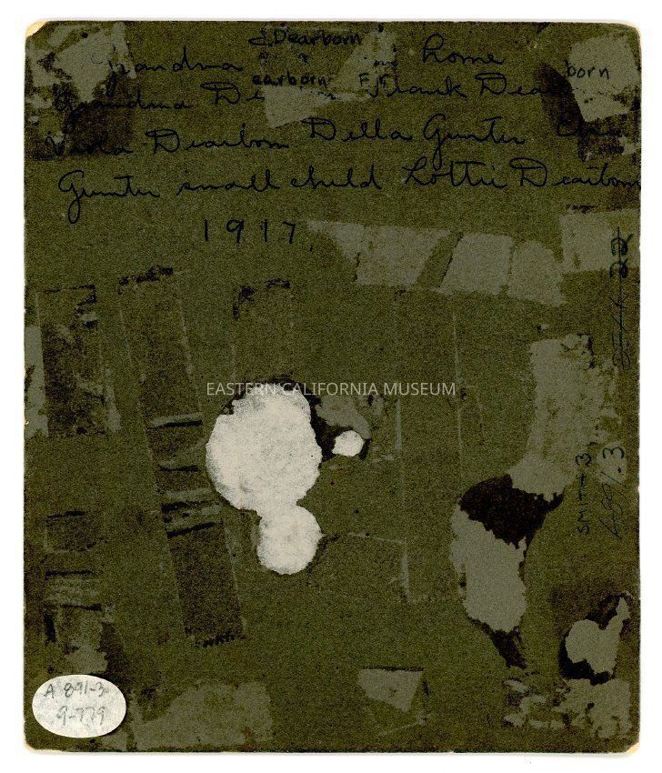 Handwritten in blue ink on reverse: Grandma Dearborn's home. Grandma Dearborn, Frank Dearborn, Viola Dearborn, Della Gunter, Elsie Gunter, small child Lottie Dearborn, 1917.